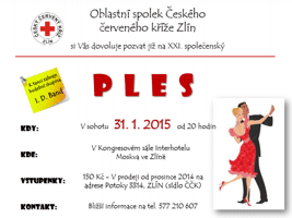 Oblastní spolek Českého červeného kříže Zlín Vás zve na tradiční ples, a to v sobotu 31. ledna 2015 v Kongresovém sále Interhotelu Moskva ve Zlíně. K tanci a poslechu zahraje od 20 hodin skupina I. D. Band. Bližší informace o možnosti zakoupení vstupenek obdržíte na tel. 577 210 607.