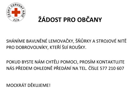 Oblastní spolek Český červený kříž Zlín proto děkuje všem, kdo se rozhodli přidat k boji s tímto virovým onemocněním a pomoci potřebným, a to ať již ve formě darování ochranných pomůcek jako jsou roušky, dezinfekce, našim dobrovolníkům pak za jejich pomoc a obětavost při rozvozu potravinových a hygienických balíčků osamělým seniorům. Za darování dezinfekce patří velký dík členům ODS, Univerzitě Tomáše Bati i členovi Poslanecké sněmovny Parlamentu ČR panu Markovi Novákovi. Zlínským zástupcům ČSSD patří náš vděk za darování šitých roušek. Všechna tato pomoc pro nás zůstává nadále velmi důležitou a moc si jí vážíme. Děkujeme!